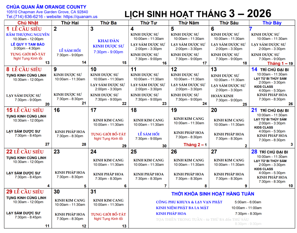CÁC THỜI KHÓA TUẦN LỄ 02 / 03 / 2026 – 08 / 03 / 2026
