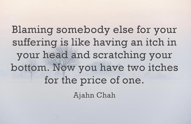 Đổ lỗi cho người khác vì sự đau khổ của mình thì cũng giống như việc ngứa trên đầu mà lại gãi dưới chân vậy. Kết cuộc là bạn bị ngứa ngáy cả đầu và chân, hai cái khó chịu cùng hiện hữu chỉ từ một nguyên nhân.