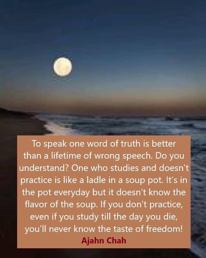 Bạn có hiểu không? Người học Đạo mà không tu thì giống như cái vá ở trong nồi cháo. Ngày nào cái vá cũng nằm trong nồi cháo nhưng không bao giờ biết đến hương vị của cháo. Người tu mà không có hành trì, thì dù có học cho đến ngày chết thì vẫn không bao giờ biết được hương vị của giải thoát !