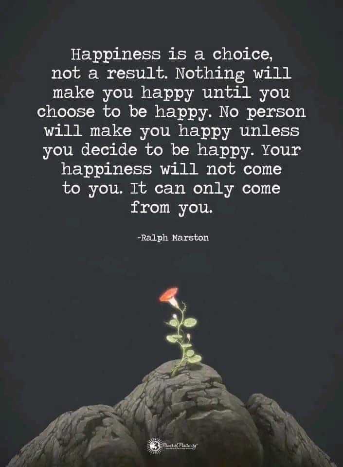 | Hạnh phúc là một sự lựa chọn, không phải là kết quả. Không có điều gì làm bạn hạnh phúc trừ phi bạn chọn cách hạnh phúc. Không ai có thể làm bạn hạnh phúc trừ khi bạn quyết định sẽ hạnh phúc. Hạnh phúc của bạn sẽ không tự tìm đến với bạn. Nó chỉ có thể xuất phát từ chính bạn. |